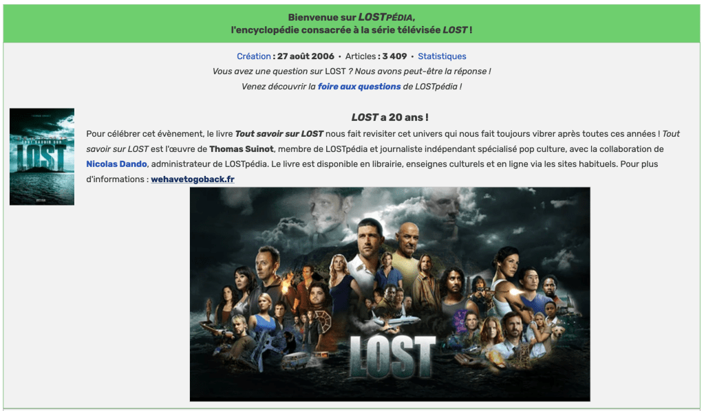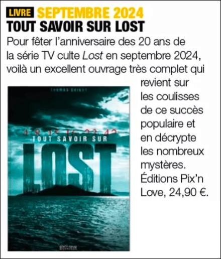 21 septembre 2024 : annonce de la sortie du livre pour les 20 ans de la série sur le célèbre site LOSTpédia ! Un véritable honneur pour ma part, merci à Nicolas Dando.