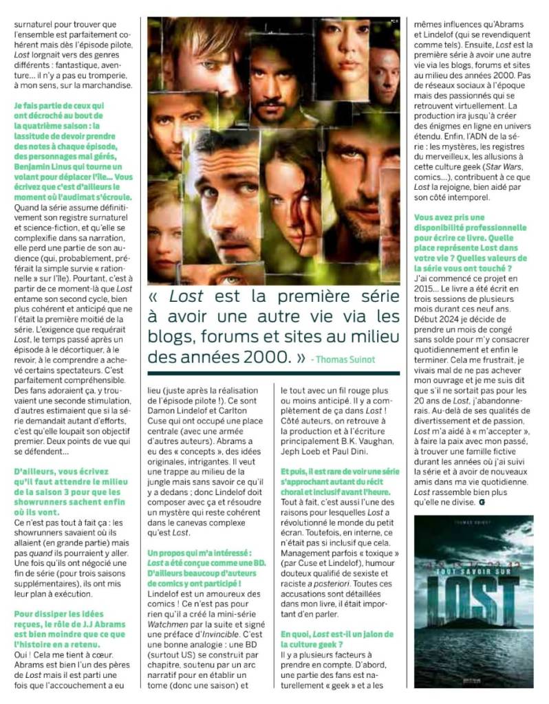 J’ai commencé ce projet en 2015… Le livre a été écrit en trois sessions de plusieurs mois durant ces 9 ans. Début 2024 je décide de prendre un mois de congé sans solde pour m’y consacrer quotidiennement et enfin le terminer. Cela me frustrait, je vivais mal de ne pas achever mon ouvrage et je me suis dit que s’il ne sortait pas pour les 20 ans de Lost (ou les 15 ans de sa fin, donc en mai 2025) j’abandonnerai. Au-delà de ses qualités de divertissement et de passion, Lost m’a aidé à « m’accepter », à faire la paix avec mon passé, à trouver une famille fictive durant les années où j’ai suivi la série et à avoir de nouveaux amis dans ma vie quotidienne. Lost rassemble bien plus qu’elle ne divise.